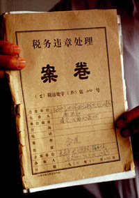 7月29日,長春市地方稅務局稽查分局查到李洪志偷稅的證據。1992年到1994年3年中,李洪志在傳授“ 法輪功”的經營行為中,偷稅8655.9元。這是稽查分局1994年對李洪志偷稅事件進行查處的案卷。 新華社記者徐 家軍攝(傳真照片)