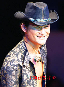 著名歌手景崗山,昨晚在北京舉行的2000中國國際時裝周的一場時裝秀上,身穿休閑裝瀟灑的在T型臺上展示。中新社記者 錢興強 攝