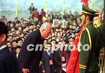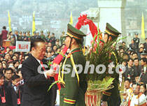 圖文:海內(nèi)外華夏子孫公祭黃帝陵 2001年4月6日 08:01 ![]() 陜西黃帝陵大祭祖。中新社記者 宋吉河 攝 ![]() 王光英向軒轅黃帝畫像敬獻(xiàn)花籃。中新社記者 宋吉河 攝 ![]() 萬國權(quán)向軒轅黃帝畫像敬獻(xiàn)花籃。中新社記者 宋吉河 攝 中新社西安四月五日電(王彥平)清明節(jié)的黃帝陵,雨后初霽,陽光普照,農(nóng)歷辛巳年公祭軒轅黃帝典禮今天在此隆重舉行。 今天在象征九五之尊的九點(diǎn)五十分,公祭典禮正式開始。全場肅立后,代表三十四個省、市、自治區(qū)和特別行政區(qū)的三十四響禮炮響起,人們的目光投向空中,仿佛在聆聽中國十二億九千五百萬華夏子孫和眾多海外同胞向中華人文初祖所要表達(dá)的殷殷懷念與追思。 海內(nèi)外各界參祭代表,在入口廣場肅立靜候片刻后,隨古樸、莊嚴(yán)的祭祀儀俯隊(duì),過軒轅橋觀龍尾道,來到軒轅廟前。 隨后鼓樂齊鳴,在威武的禮儀士兵引領(lǐng)下,全國人大常委會副委員長王光英、全國政協(xié)副主席萬國權(quán)等分別向黃帝像敬獻(xiàn)花籃。 在身著盛裝的禮儀小姐們向始祖敬獻(xiàn)了鮮花、時果等祭品后,陜西省省長程安東恭讀了辛巳年清明公祭軒轅黃帝祭文。 最后,所有參祭的各界代表向黃帝像行三鞠躬大禮。(完) |