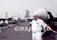 美國航空母艦“星座號”20日抵達(dá)香港,進(jìn)行補給及維修,并公開予傳媒參觀。圖為一名海軍士兵向傳媒介紹艦上設(shè)施。中新社傳真 盧峰 攝
