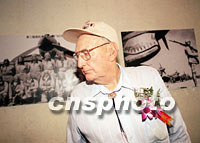 美國飛虎隊飛行隊長、飛虎隊功勛飛行員羅伯特·詹姆斯·雷思5日在北京蘆溝橋中國抗日戰爭紀念館參加美國飛虎隊援華抗日60周年座談會,當他看到1941年拍攝的飛虎隊將士與中國工民一道抗擊日本侵略者的歷史圖片時感慨萬千。中新社記者 王瑤 攝