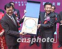 在重慶市二十七日舉行的“重慶·香港周”開幕式上,香港特區政府駐北京辦事處主任梁寶榮與重慶市副市長王鴻舉互贈禮品。中新社圖 雷鳴 攝