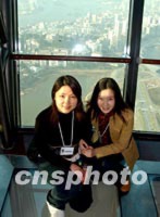 投資十億元澳門幣興建的澳門旅游塔會展娛樂中心澳門回歸祖國兩周年之際交付使用,圖為參觀者在高達三百三十八米的旅游塔內俯瞰澳門并留影。中新社傳真 宗金柱 攝