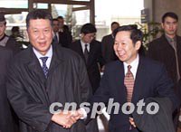 前來(lái)述職的澳門特別行政區(qū)行政長(zhǎng)官何厚鏵,二十五日抵達(dá)北京并下榻港澳中心。國(guó)務(wù)院港澳辦公室副主任陳佐洱在港澳中心大堂迎接。中新社記者 毛建軍 攝