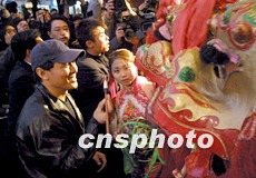 名揚(yáng)海外的“功夫皇帝”李連杰二十三日在北京新東安商場(chǎng)影視城為其新作《宇宙追緝令》做宣傳,一隊(duì)舞獅者在商場(chǎng)門前迎接闊別家鄉(xiāng)多年的李連杰,李連杰高興地為獅子點(diǎn)睛。中新社記者 李剛 攝