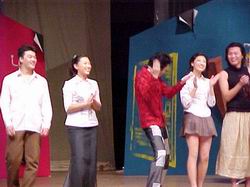 評(píng)論:時(shí)尚喜劇《翠花,上酸菜》因何火爆? 2002年02月06日 10:16 ![]() 翠劇主要貫穿人物王小怡(喬瑜巖飾) 南方鯤 攝 ![]() 翠花上酸菜演員謝幕 南方鯤 攝 中新網(wǎng)北京2月6日消息(作者南方鯤)中戲表演98班集體改編創(chuàng)作的喜劇〈翠花,上酸菜〉,在年終歲末火爆了京城話劇舞臺(tái)。目前正在實(shí)驗(yàn)話劇院劇場(chǎng)進(jìn)行第三輪演出。 由班主任田有良導(dǎo)演、這個(gè)班十幾位初出茅廬的同學(xué)協(xié)力演出的這出戲,取材當(dāng)今都市青年網(wǎng)民的時(shí)尚生活——網(wǎng)上交友求偶的種種經(jīng)歷,這些多半淺俗入世或時(shí)顯奇誕不經(jīng)的人物遭遇,如何在該劇中能演繹得環(huán)環(huán)相連令人忍俊不禁,以至這部?jī)?nèi)容看似平常的喜劇先于去年十二月在青藝劇場(chǎng)勁演旬余、新年一月份移師兒藝劇院再演十來(lái)場(chǎng)均場(chǎng)場(chǎng)爆滿,以至其票房效益居同期首都話劇界之首呢? 仔細(xì)琢磨一下該劇就能看出,年輕的導(dǎo)演和演職員們對(duì)改編原作電視劇的素材作了頗有藝術(shù)追求的再創(chuàng)作。他們讓主要角色表演及所構(gòu)成的生活圖景,不時(shí)或因時(shí)尚行為卡通化、而具詼諧反諷之效;或因男女角反串演示和“土”“洋”人物定位倒置、而顯其黑色幽默韻味。另一更突出的效果,則因編導(dǎo)頗具匠心地將時(shí)下人們耳熟能詳?shù)碾娨晱V告語(yǔ)言,(包括一組以新聞形式出現(xiàn)的宣傳廣告),經(jīng)由表演形象再現(xiàn),將其固有的浮躁夸張色彩聚焦放大,鋪染在全劇各段落之間,和劇中的奇、躁色調(diào)形成別致的參差對(duì)照,凸顯了觀照時(shí)尚生活之荒誕性的黑色幽默。 顯然,《翠》劇年輕的創(chuàng)作者們?cè)谕敢暩爬ㄉ畹暮穸群捅憩F(xiàn)力度上尚有加強(qiáng)的余地,然而可貴的是,他們對(duì)現(xiàn)代話劇藝術(shù)的理解顯示出有著一種靈敏的悟性;有了這種悟性,才可能在本文稱為時(shí)尚喜劇的創(chuàng)作中,做到“淺入深出”(實(shí)應(yīng)為“潛入深出”)。正因?yàn)槿绱耍?jiàn)多識(shí)廣的北京觀眾對(duì)該劇給予了相當(dāng)熱情的接納。