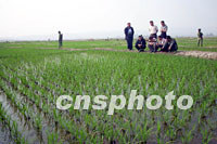 云南省西雙版納傣族自治州種子公司的專家,在金三角大其力西北面一百二十多公里處的緬甸萬(wàn)宏地區(qū),幫助當(dāng)?shù)貙?shí)施毒品替代種植的工作已經(jīng)啟動(dòng),并已展現(xiàn)出廣闊的前景:首批種植的五百畝早稻秧苗已是一片嫩綠。圖為專家組在田邊視察。作者:納家驊
