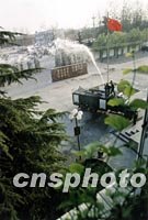 北京大興武警后勤基地消防隊(duì),三月結(jié)合消防演練任務(wù),派消防車一邊給大樹澆水,一邊訓(xùn)練消防動(dòng)作,一舉兩得。中新社圖 曹文 攝