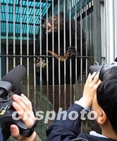 傷害黑熊和棕熊的清華大學學生劉海洋已被取保候?qū)?被傷害的一只黑熊仍在動物園醫(yī)院的監(jiān)護室里接受治療,29日,北京眾多媒體記者在采訪時看到在病室里的滿面?zhèn)鄣暮谛苋允滞纯唷V行律缬浾?李剛 攝