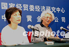 受國家經貿委經濟研究中心之邀,香港著名經濟學家張五常(右)二十三日在北京釣魚臺大酒店作學術演講。中新社圖 武仲林 攝