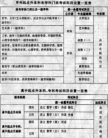 全國成人高考科目設置明年將作進一步調整(附表) 2002年06月05日 16:09 ![]() 中新網北京6月5日消息:據中國教育報報道,為了使考試科目的設置更加適應成人高等教育的特點,更有利于提高成人高校招生的生源質量和今后的培養,有利于考試的組織和管理,從2003年起中國成人高校招生考試科目設置做進一步的調整: 1.專科起點升本科統考科目按學科門類設置,不再按生源類別設置。統考科目為政治、外語和專業基礎課3門。專業基礎課根據各學科門類的特點設置8門(見專科起點升本科各學科門類考試科目設置一覽表),由招生院校按專業的需要規定考生應試其中一門。 2.高中起點升專科(含高職)、高中起點升本科考試按文科、理科分別設置統考科目。其中,高中起點升專科(含高職)統考科目為語文、數學(分文科類、理科類兩種,下同)、外語3門,主要考查考生是否具備接受高等專科層次教育的最基本要求。考慮到本科教育與專科教育培養目標和教學要求的不同,報考高中起點升本科的統考科目的理科類考生增加一門“物理化學綜合課”(簡稱物化),文科類考生增加一門“歷史地理綜合課”(簡稱史地)(見高中起點升本科、專科考試科目設置一覽表)。 3.各類考生除參加上述規定的統考科目考試外,招生院校可根據專業要求自行確定是否再加試一門考試科目。如需加試,招生院校必須在招生簡章中注明并自行命題和組織考試,于錄取工作開始前,向有關省級成人高校招生辦公室提交加試合格考生名單。錄取時,省級成人高校招生辦公室根據加試合格考生名單向招生院校投檔,招生院校根據考生參加統考的成績,由高分到低分擇優錄取(藝術類和體育類專業在考生文化課符合要求的基礎上,按加試專業課成績從高分到低分錄取)。不需加試的院校,按考生參加統考科目的成績錄取。 4.統考科目除專科升本科考試的民法試題由司法部命制外,其他試題均由教育部統一命制。各門試題滿分為150分;高中起點升本科、專科的統考科目每門考試時間為120分鐘,專科升本科每門考試時間為150分鐘。