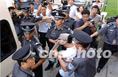 猥褻多名男童的青年歌星紅豆二十日在北京朝陽法院被一審判處三年零六個月的徒刑。圖為紅豆在法庭宣判結束后,用衣服捂著頭走上囚車。作者:武仲林