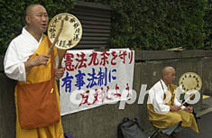 日本山妙法寺的僧侶在國會議員會館前頌經(jīng),反對正在國會審議的有事法制,要求日本政府嚴(yán)守“放棄戰(zhàn)爭”的憲法第九條。作者:陶光雄