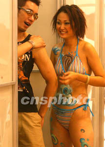 中國各地今夏酷暑難當,京城青年興起人體彩繪游戲。她們展露美麗身材,追求彩繪與三點式服飾的和諧,尤為賞心悅目。作者:賈國榮