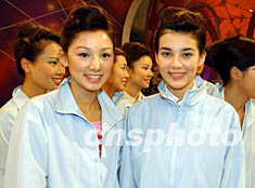 二零零二年度香港小姐準(zhǔn)決賽入圍的十二位佳麗,七月二十二日參加香港新舊港姐“三十年傾城之約拜神儀式”,其中本年度最上鏡港姐嘉碧儀(左)與左慧琪成為關(guān)注焦點。潘索菲 攝