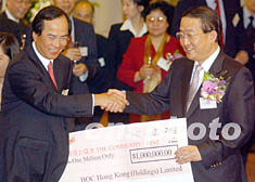 "中銀香港(控股)有限公司"7月25日成功在香港上市掛牌后,中國銀行副董事長,中銀香港(控股)有限公司、中國銀行(香港)有限公司副董事長及總裁劉金寶(右)向香港公益金籌款委員會主席柯清輝贈送一百萬港元支票。任晨鳴 攝