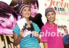 樂壇女子組合Twins兩位成員蔡卓妍(左)、鍾欣桐8日1日在香港舉行“愛上色彩之歷險”寫真集簽名會,Twins兩位成員蔡卓妍、鍾欣桐手持寫真集向在場歌迷展示。鄧慶樂 攝
