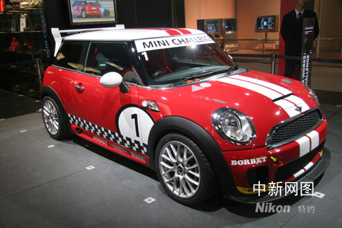 寶馬展臺上,人氣最旺的展車非MINI莫屬。藍、黃、紅、香檳色四款張著大嘴的酷酷小車,動力澎湃驚人。其中一襲賽車彩衣的MINI John Cooper Works CHALLENGE為亞洲首次亮相。(涂露芳)