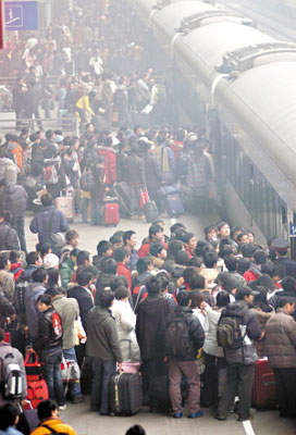 每年寒假,學生都會碰上春運人潮,圖為大學生在南京火車站乘車。