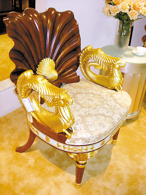 炎炎夏日,貝殼是能為人們帶來清涼氣息的造型代表。這張“貝殼椅”的椅背被設(shè)計成貝殼狀,它完全由手工制成,價值不菲。扶手部位的動物雕花是先雕刻出來后再在上面鍍了一層24K的工業(yè)金,與黃金同樣顯現(xiàn)奢華氣派卻更容易打理;為了配合這一季的特點,椅子的腰背部位裝飾著一顆真正的貝殼,華貴中又帶著撲面而來的海洋氣息。