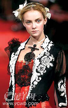 設計師對于古典的鐘愛依然可見,蕾絲鏤花、古雅的抽象藤蔓圖案、裙擺上盤轉回旋的浪花形飾邊,讓人聯想起冷艷貴婦形象。與服飾搭配得當的各款帽飾多以另類夸張造型引人注目,舉手投足便又多了一道賞心悅目的風景。 (奕茜)