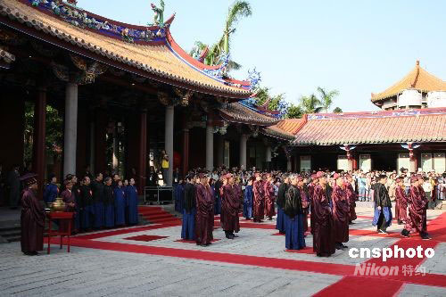 十月五日,臺北祭孔大典依舊制開始。著褐色古袍的引領人員引領“主獻官”臺北市長郝龍斌及“分獻官”、“陪祭官”等入場,郝龍斌及作為“分獻官”、“陪祭官”的十幾位臺北優秀教師和各界代表,著藍色長袍,黑色馬褂,依次走向固定位置佇立。中新社發 楊旭 攝