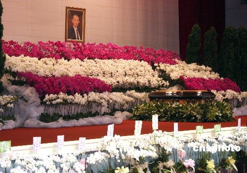 臺塑企業創辦人王永慶的遺體十七日由長榮班機運抵臺灣,靈堂設在桃園縣的長庚大學活動中心。圖為棺木安放在靈堂內景。中新社發 耿軍 攝