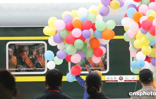 七月一日,青藏鐵路通車慶典在青海格爾木火車站南廣場舉行,中共中央總書記、國家主席胡錦濤出席并作重要講話。首列進藏旅客列車于中午由青海格爾木出發駛往拉薩。中新社發 武仲林 攝