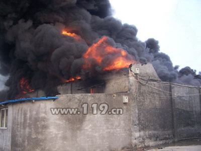 到達火災現場后,經過指揮員火情偵察,發現發生火災的為一座儲存油漆等化工危險品的簡易倉庫,火勢處于迅猛發展階段,并迅速向東面相鄰的山東電視臺存放布景道具的倉庫蔓延(里面存放著價值50萬元左右物資),情況十分危急,中隊指揮員立即兵分兩路,15噸水罐車出單干線兩槍操,一支槍在南側倉庫上方壓制化工品倉庫內部火勢,另一支槍控制住正向東蔓延的火勢,防止引起更大面積的火災。中隊斯太爾泡沫水罐于物資倉庫北側,出單干線一支槍壓制火勢防止火勢向北側民用房蔓延。