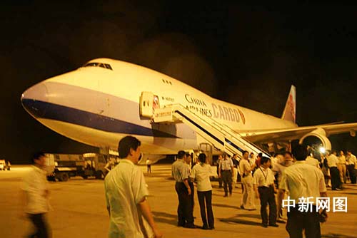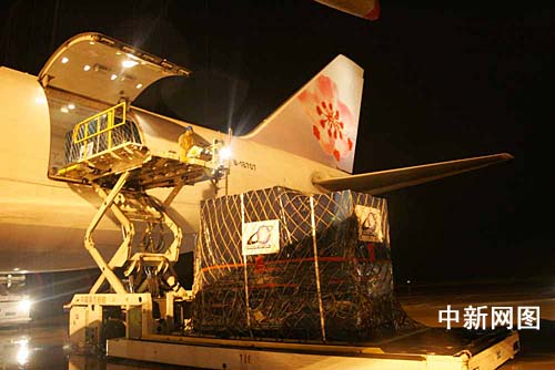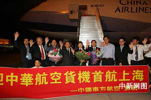 兩岸首班專案貨運(yùn)包機(jī)——臺灣“中華航空公司”CI六九○一航班于七月二十日凌晨零時三十三分飛抵上海浦東機(jī)場。浦東機(jī)場拉出了歡迎華航貨機(jī)的橫幅,上書“熱烈歡迎中華航空貨機(jī)首航上海”。潘索菲 攝