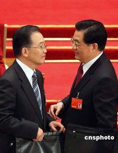 圖:胡錦濤、溫家寶在人大會上交談
