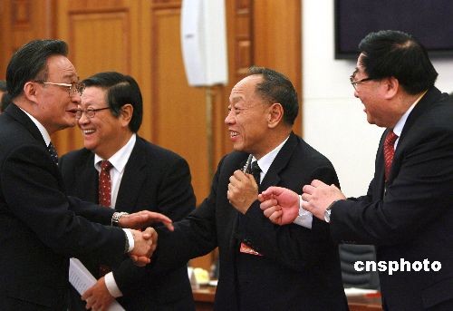 3月18日,十一屆全國人大常委會(huì)在北京人民大會(huì)堂舉行第一次委員長會(huì)議。全國人大常委會(huì)委員長吳邦國在會(huì)后與新任的人大主任委員們握手致意。中新社發(fā) 廖文靜 攝