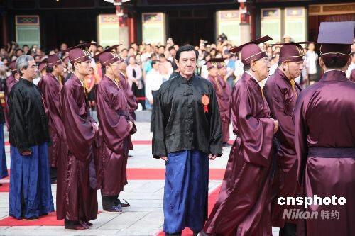 十月五日,臺北祭孔大典依舊制舉行。“主獻官”及“分獻官”、“陪祭官”均著藍色長袍,黑色馬褂參加儀式。圖為臺灣領導人馬英九入臺北孔廟上香行禮。中新社發 楊旭 攝