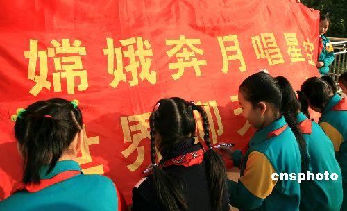11月5日,“嫦娥一號”衛星成功減速,進入月球軌道。山東師大附小為此舉辦了“嫦娥一號”主題慶祝儀式,師生們在祝賀“嫦娥一號”成功奔月的橫幅上簽字。孩子們還向研制“嫦娥一號”的科學家們寫了熱情洋溢的祝賀信,表達對他們的祝賀和自己要好好學習、建設祖國的決心。中新社發 周青先 攝