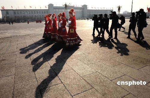 三月五日上午九時,十一屆全國人大一次會議在北京人民大會堂隆重開幕。攝影記者在天安門廣場窮追不舍拍攝穿著少數民族服飾的亮麗女服務員。中新社發 廖攀 攝