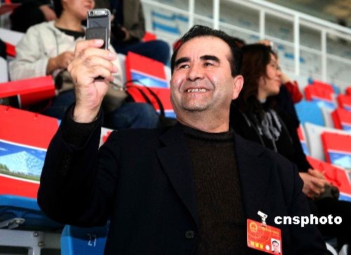 在國(guó)家游泳館,來(lái)自新疆代表團(tuán)的努爾拉·阿尤甫代表在用手機(jī)拍攝“水立方”場(chǎng)內(nèi)景。