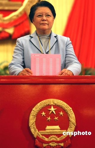 三月十五日上午,十一屆全國人大一次會議第五次全體會議在北京人民大會堂舉行,表決關于批準國務院機構改革方案的決定草案,選舉十一屆全國人大常委會委員長、副委員長、秘書長和常委,選舉國家主席、副主席及中央軍委主席等。圖為當選為十一屆全國人大常委會常委的香港全國人大代表范徐麗泰在會場投票。中新社發 任晨鳴 攝