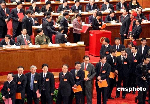 3月16日上午,十一屆全國人大一次會議第六次全體會議在北京人民大會堂舉行,決定國務院總理、中央軍委副主席、委員的人選,選舉最高人民法院院長、最高人民檢察院檢察長。圖為全國人大代表排隊進行表決和選舉投票。中新社發 張宇 攝