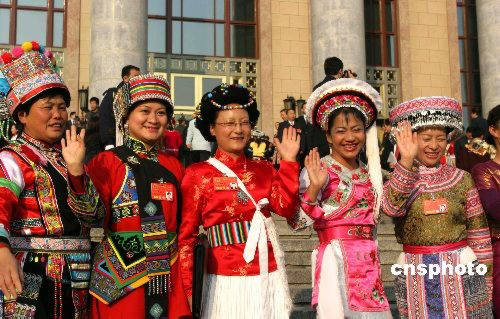 3月5日,十一屆全國人大一次會議在北京開幕,身著節日盛裝的各少數民族代表,進入會場前在北京人民大會堂前接受媒體采訪。中新社發 柳俊武 攝