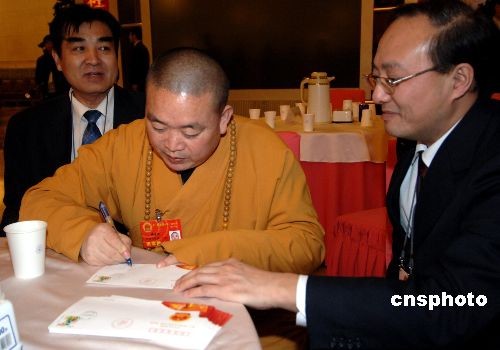 全國兩會召開期間,全國人大代表、少林寺方丈釋永信成為會上引人注目的明星,經常有媒體采訪和代表委員求簽名。圖為他在給代表簽名兩會紀念郵票首日封。中新社發 王東明 攝