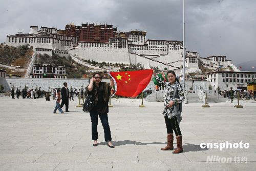 圖為兩名來自東北的游客在布達拉宮廣場展示國旗,祝福北京奧運成功。