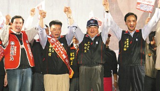 國民黨2008參選人馬英九(左一)與臺中市長胡志強(qiáng)(右二)、桃園縣長朱立倫(右)昨晚到臺南,幫“立委”候選人高思博(左二)站臺。(圖:臺灣《聯(lián)合報(bào)》)
