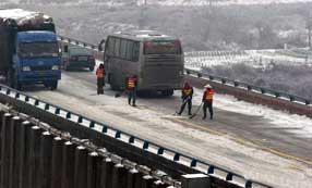 為將被困京珠北高速公路梅花至坪石之間10公里的群眾疏導出來,昨日下午京珠北高速公路公司啟動鏟車為路面破冰、除冰。據悉,此次啟動的鏟車破冰行動在廣東省尚屬首次,但初步估計,僅高速公路路面將受損達到上千萬元……