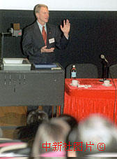 ‘曾三次執行太空穿梭機特別飛行任務的美國太空人尼爾遜博士,十月二十一日在香港科學館舉行的“二十一世紀科學及科技教育透視”研討會上作演講。中新社傳真 任海霞攝