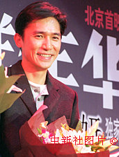 在53屆戛納電影節(jié)上榮獲兩項大獎的中國經(jīng)典影片《花樣年華》,二十四日晚在北京嘉里中心飯店舉行首映式,影片中男主角扮演者,著名影星梁朝偉出席了首映式。中新社記者 錢興強 攝
