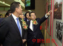 “中華百年歷程圖片展”十二日在澳門展覽中心開幕,行政長官何厚鏵、中聯(lián)辦主任王啟人在紀(jì)錄港澳回歸的圖片前駐足。中新社傳真 宗金柱 攝