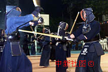 澳門體育界慶祝澳門回歸祖國一周年表演晚會17日晚在塔石球場舉行。集體棍運動員身著全副裝備表演。中新社記者 滿會喬攝