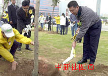 何厚鏵為回歸一周年植樹(橫片)。為慶祝澳門回歸一周年,特區行政長官何厚鏵十七日在蓮花廣場附近種下一棵紀念樹。中新社傳真 宗金柱攝