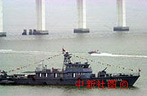 中國國家主席江澤民19日抵達澳門特區出席慶祝澳門回歸一周年慶典活動,中國邊防海警炮艇清晨在澳門海域戒備,作好安全保護工作。中新社傳真洪少葵攝