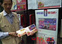 澳門郵政局20日發行澳門特區成立一周年紀念郵票,專門從香港乘早班船到澳門訂購郵票的朱炳然先生高興的展示排隊選購到的紀念郵票。中新社傳真洪少葵攝